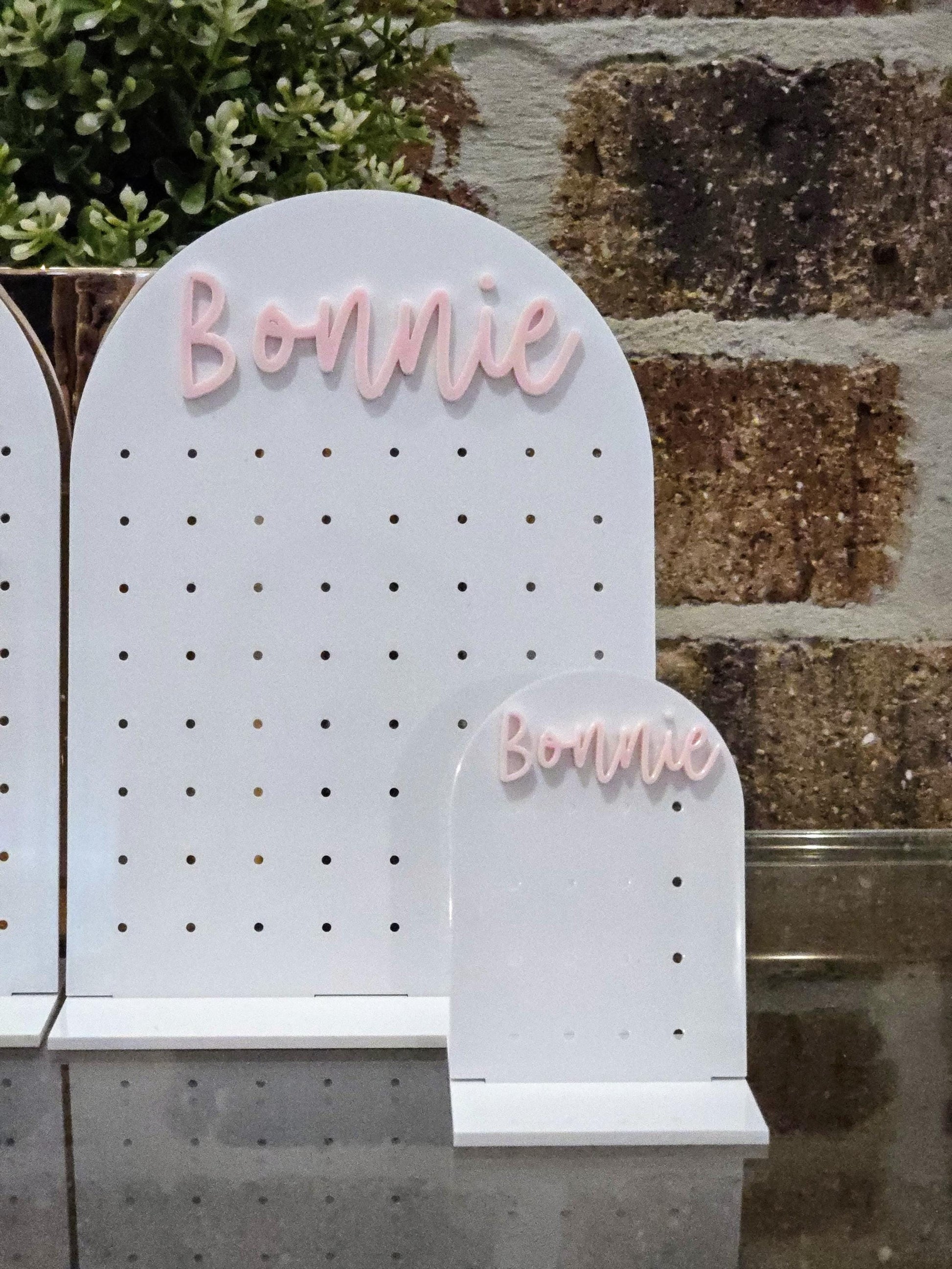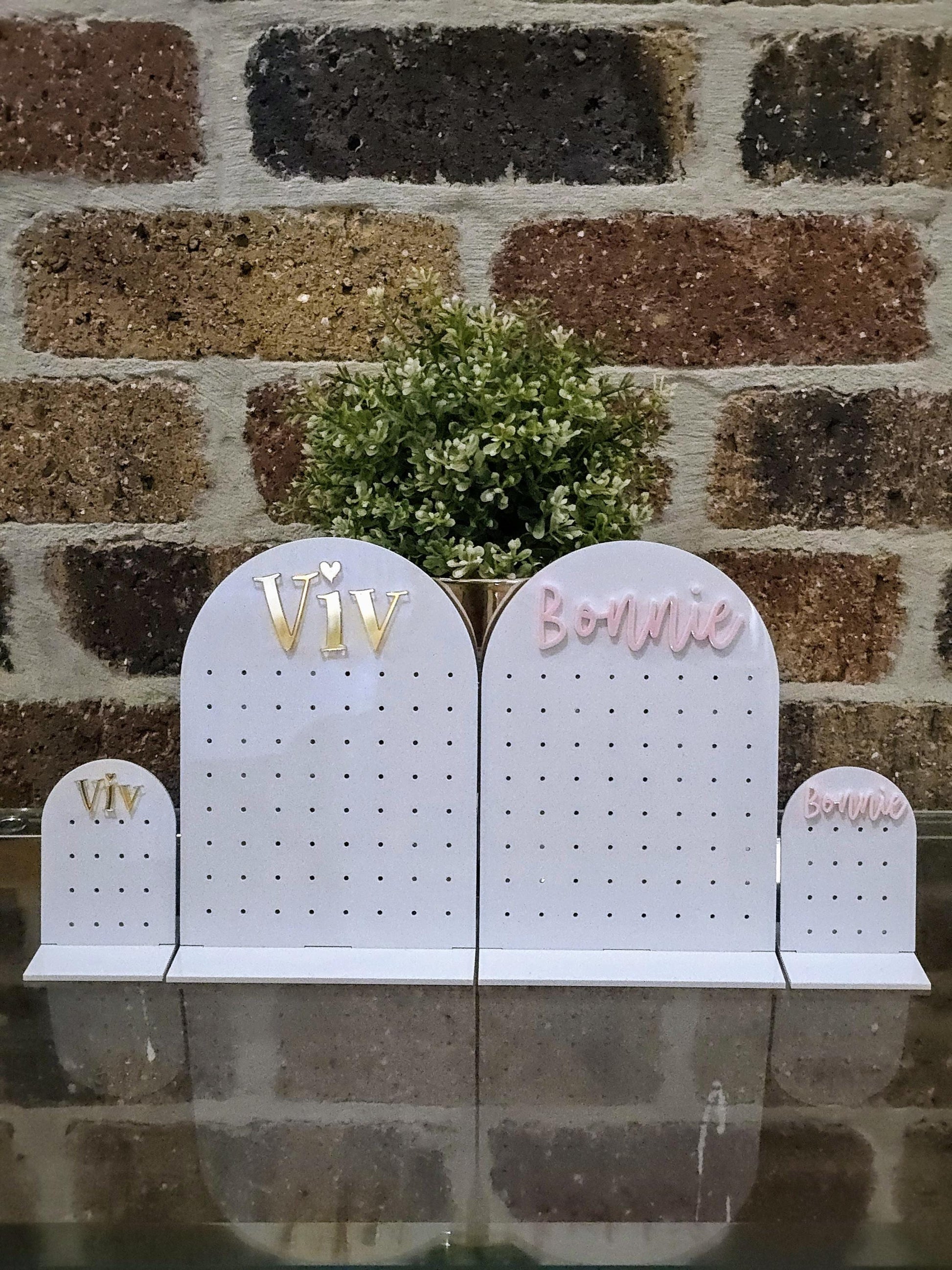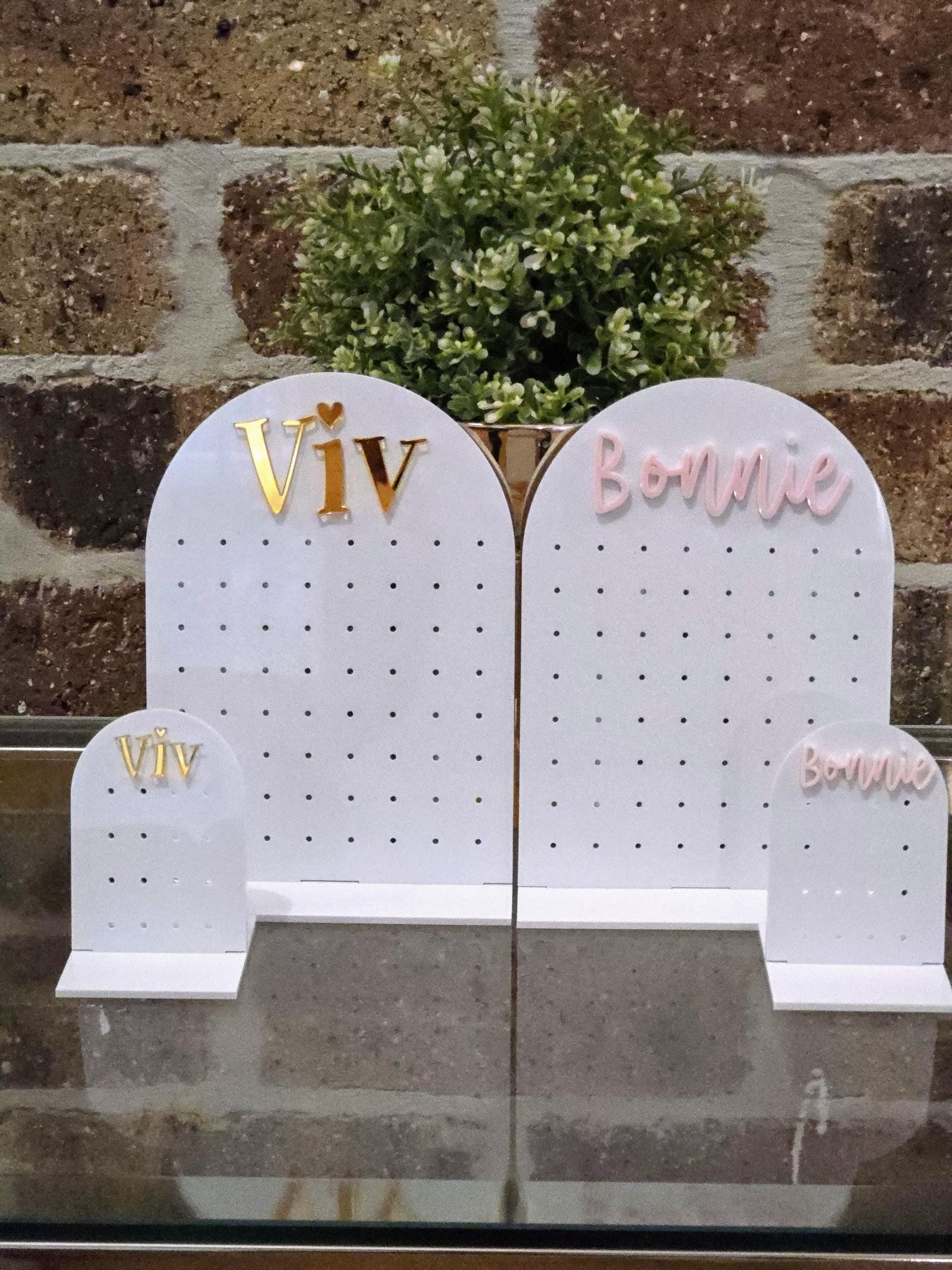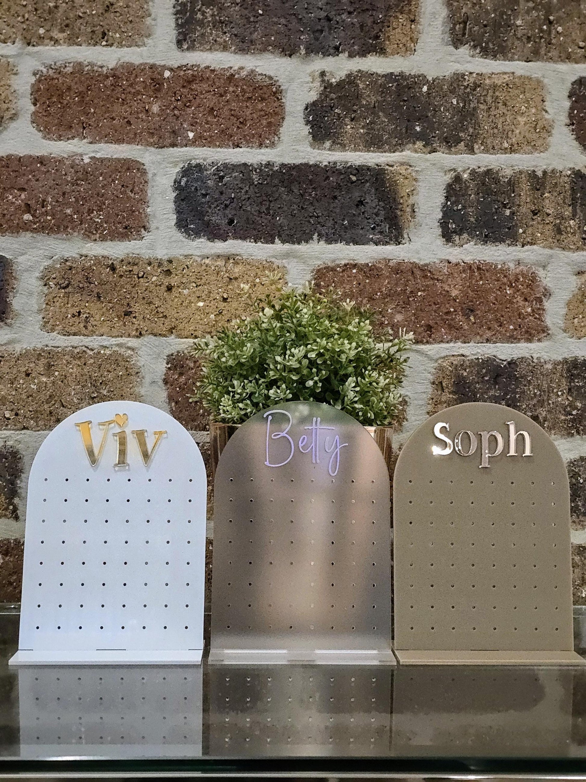 Presenting our Earring Holder Stand with 3D Lettering – the perfect gift that keeps your earrings organized and within easy reach. This handmade piece is carefully crafted by a small business in Australia and made to order just for you. The elegantly arched design accommodates your favorite stud earrings. Customizable 3D lettering adds a unique touch to your jewelry collection.