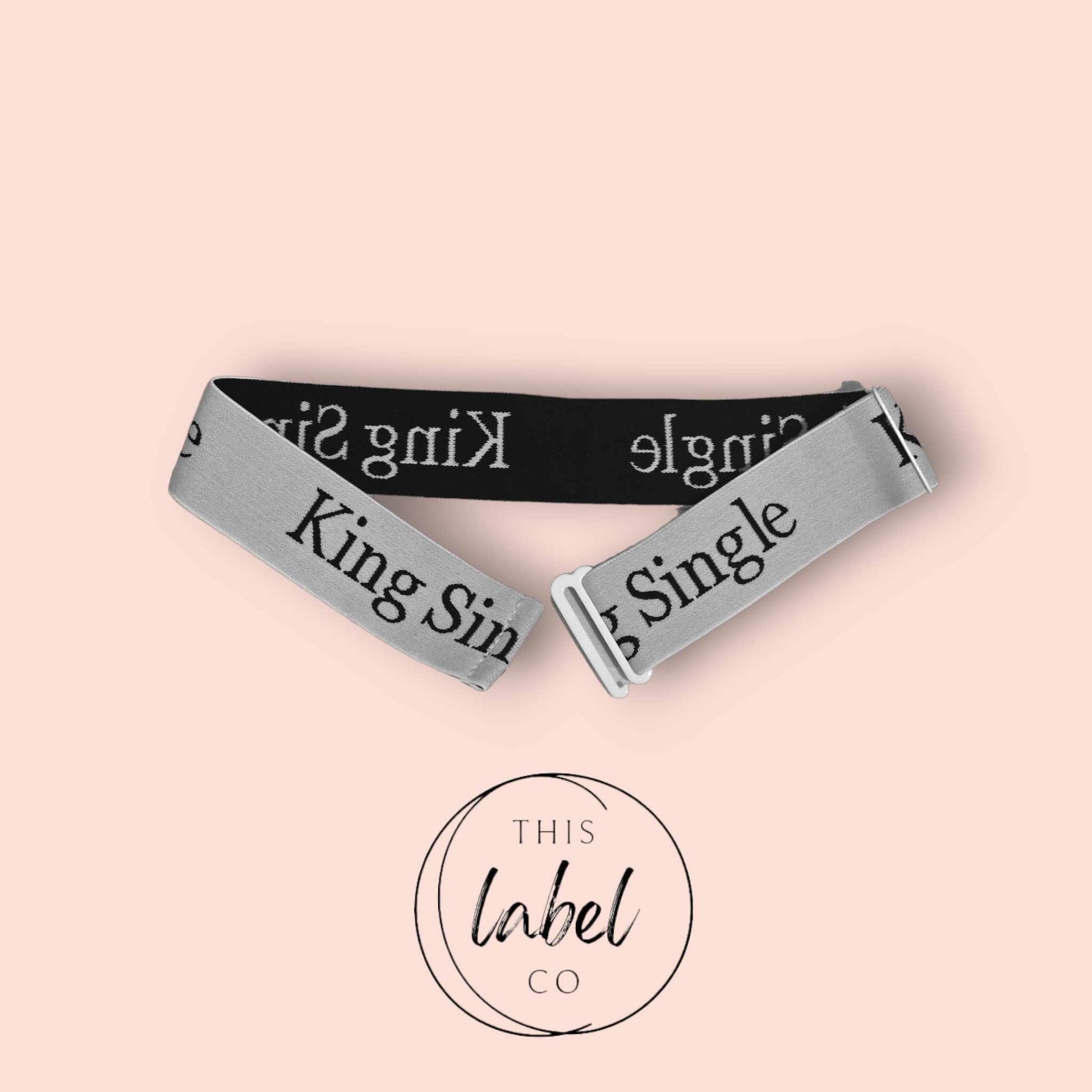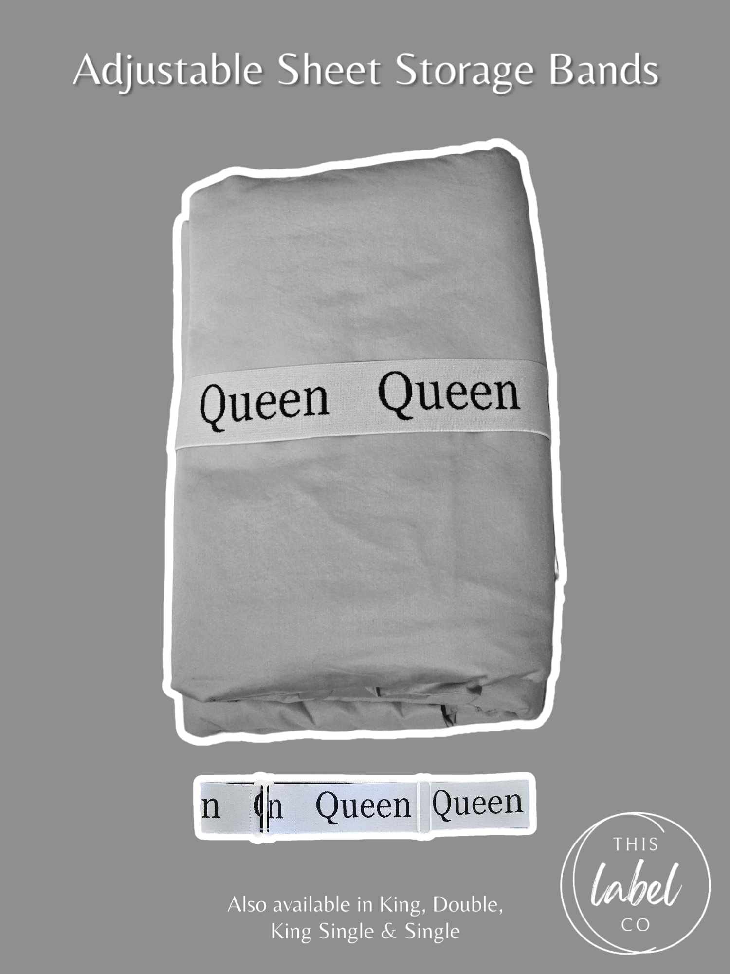 These white bedding bands are crafted from durable elastic material, lightweight, & clear text printing. Keep sheet sets neatly together in 5 different sizes. Quick Sheet Identification: Easily locate your bed sheets, pillowcases, protectors, mattress pads, doona covers by folding them as usual and then wrapping them with these distinguishable sheet label bedding bands.