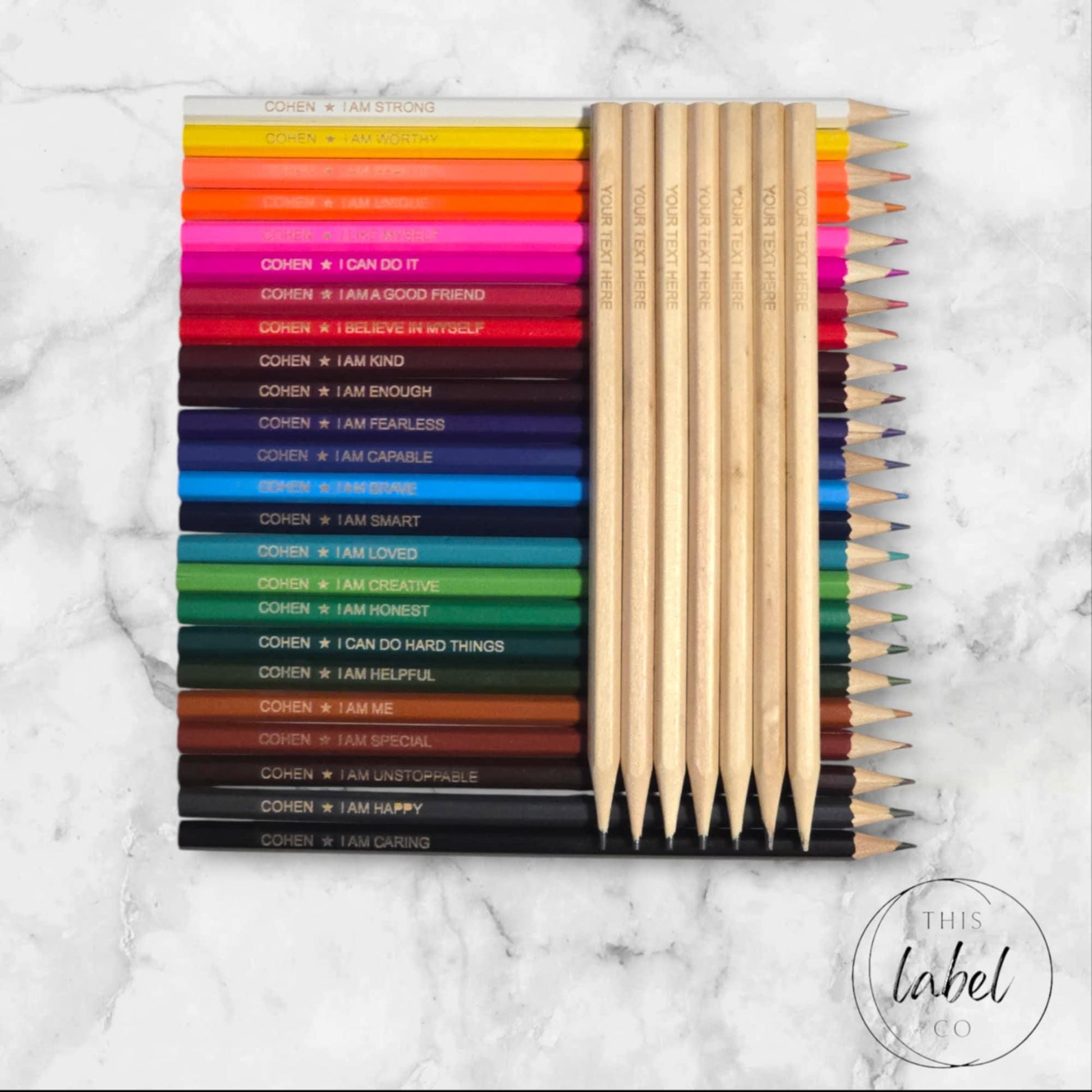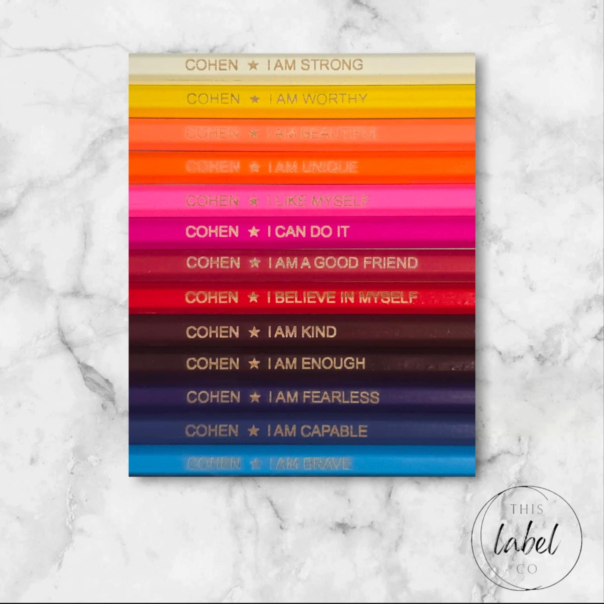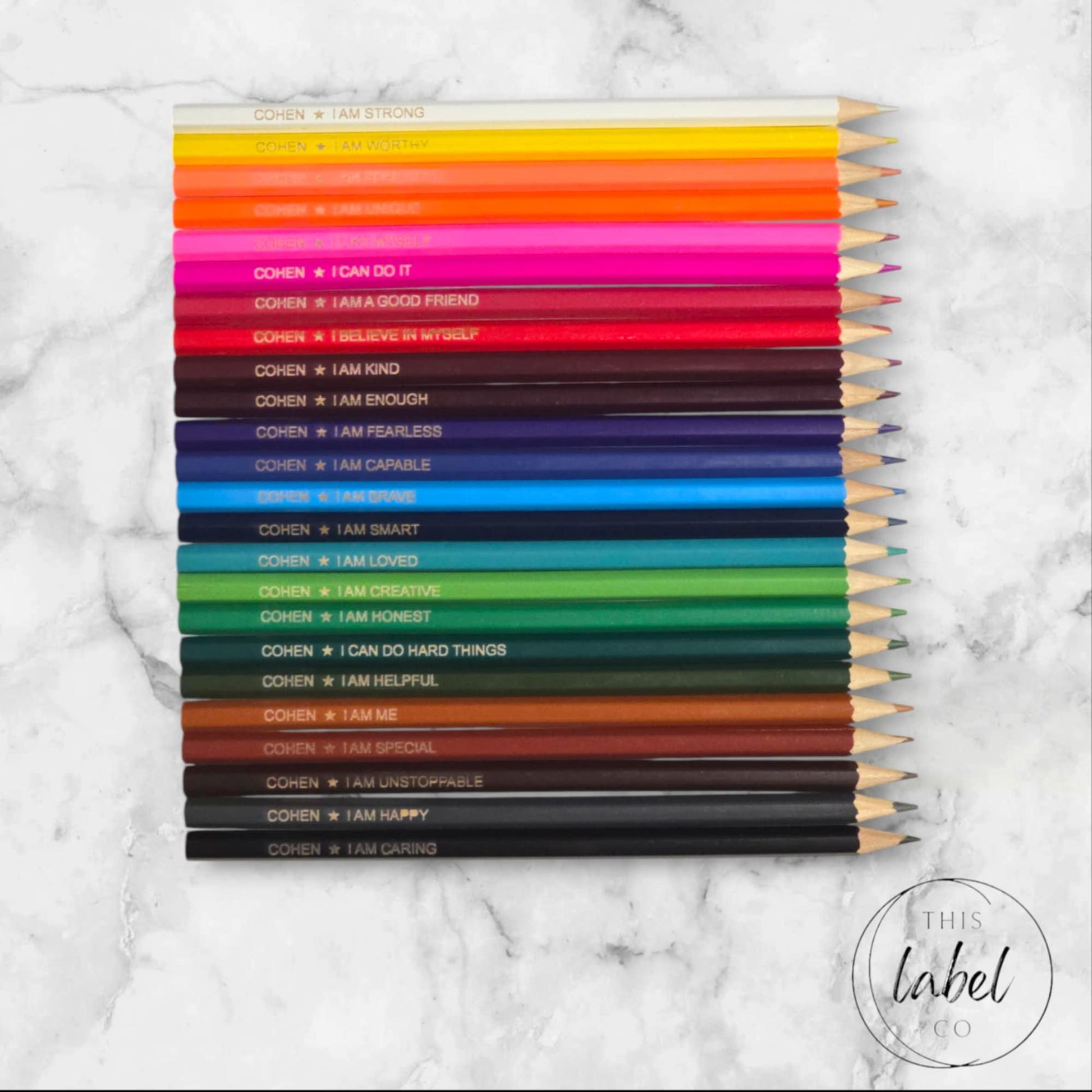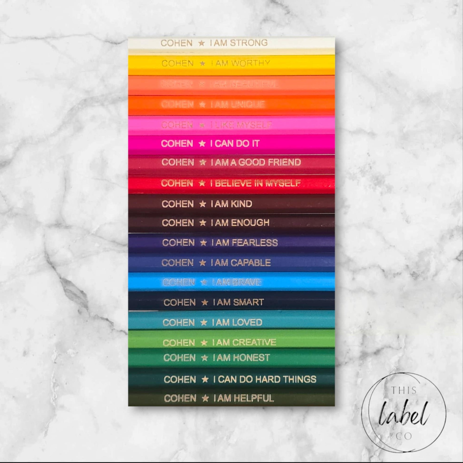 Positive affirmations serve as a powerful resource, particularly for children. Our personalized pencils are perfect for both school & home use. Each colorful set of 24 features the child’s name, a symbol, & a positive affirmation, with all affirmations listed below.