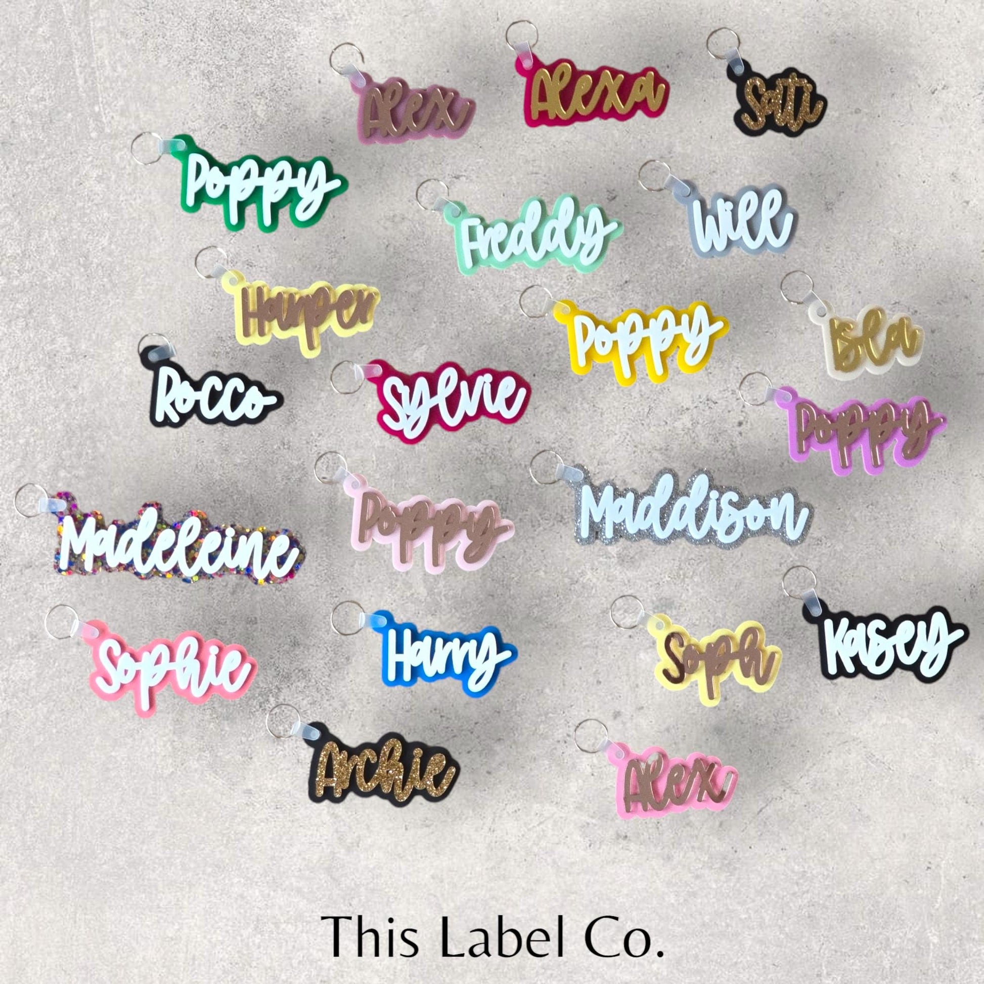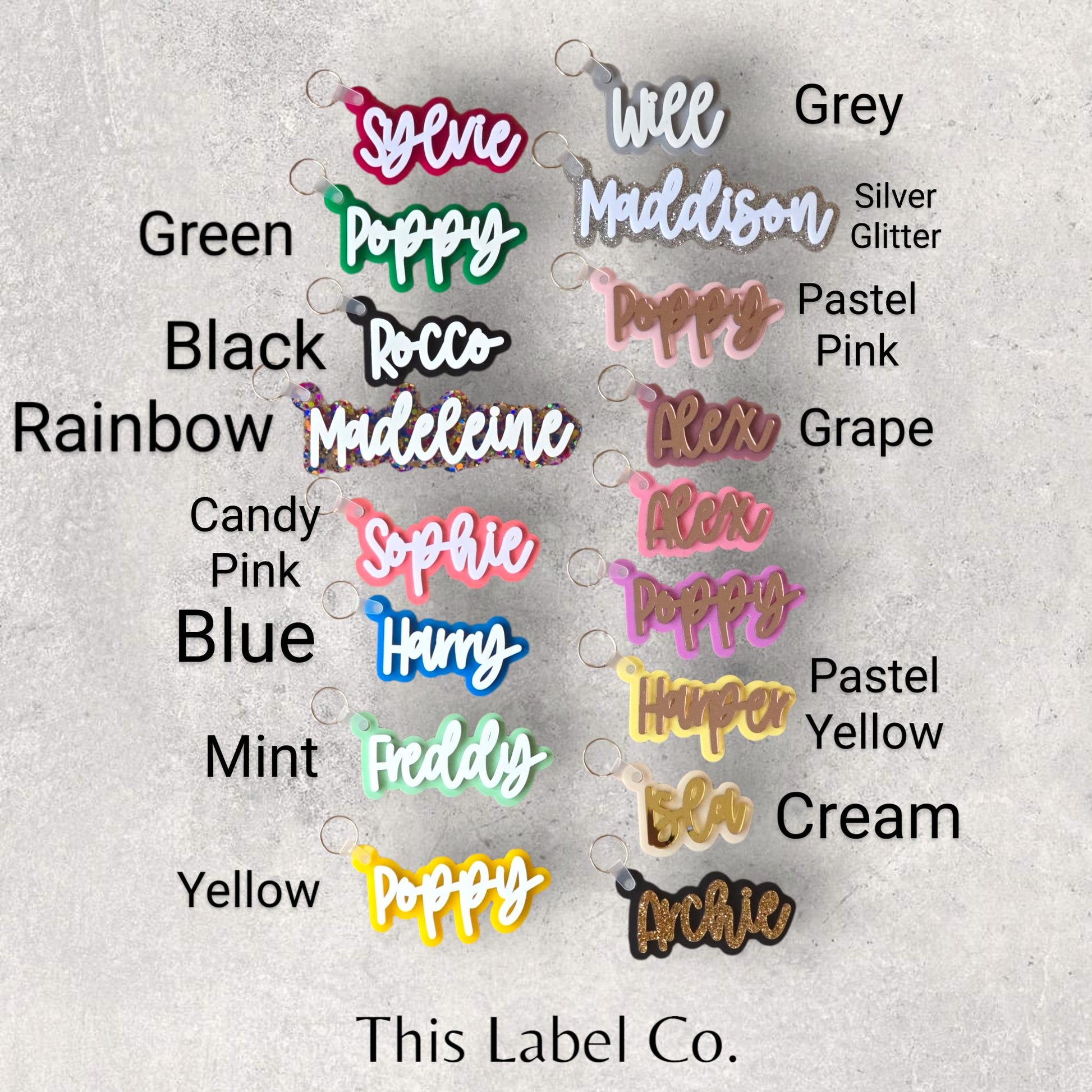 Two Layer Acrylic Name Keyrings/Bag Tags Our Personalised Acrylic Bag Tags are a cute and practical way to label kids Kinder, Day care and School bags to make it easy to find amongst the hundreds of kids bags. If there is a specific colour you're after and you can't see it listed, please get in touch and we will do our best to do a special order. Each bag tag is roughly 5-10cm long depending on how many letters in the name and is finished with a keyring or plastic strap. Please be sure to state in the personalisation section which option you would like out of the keyring or clear strap. Default option will be a keyring. -Important information-