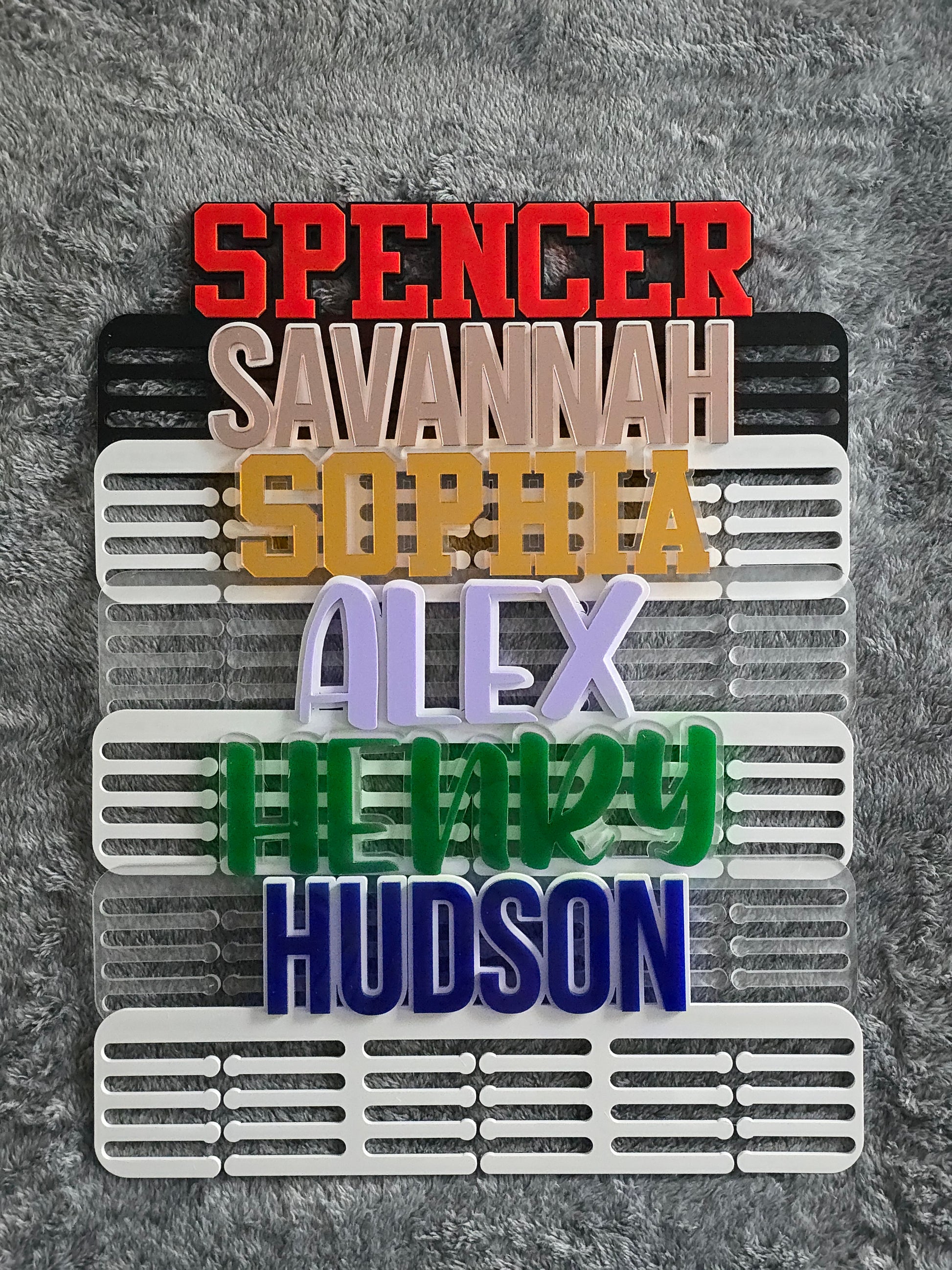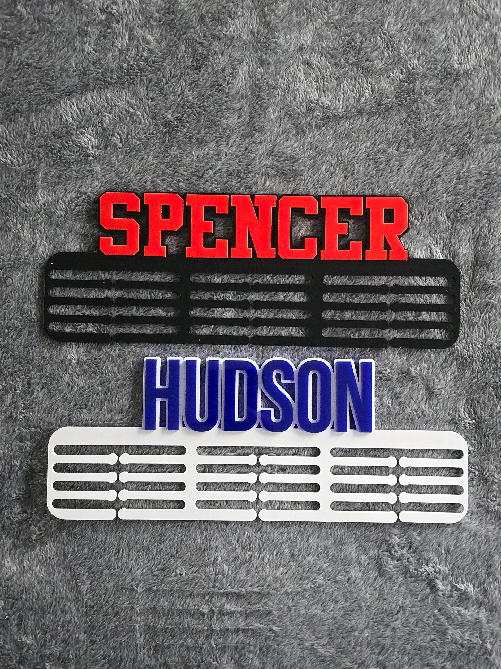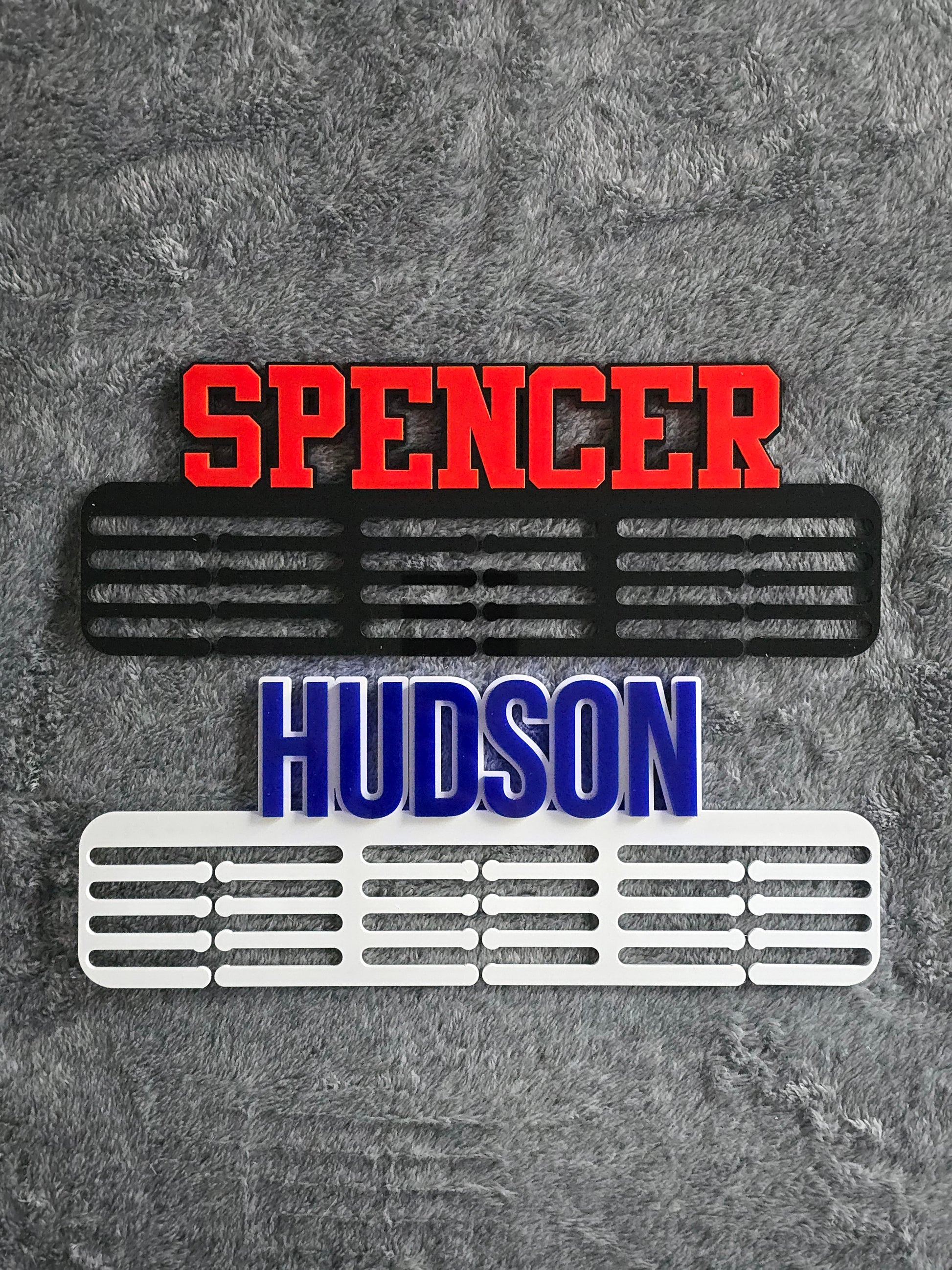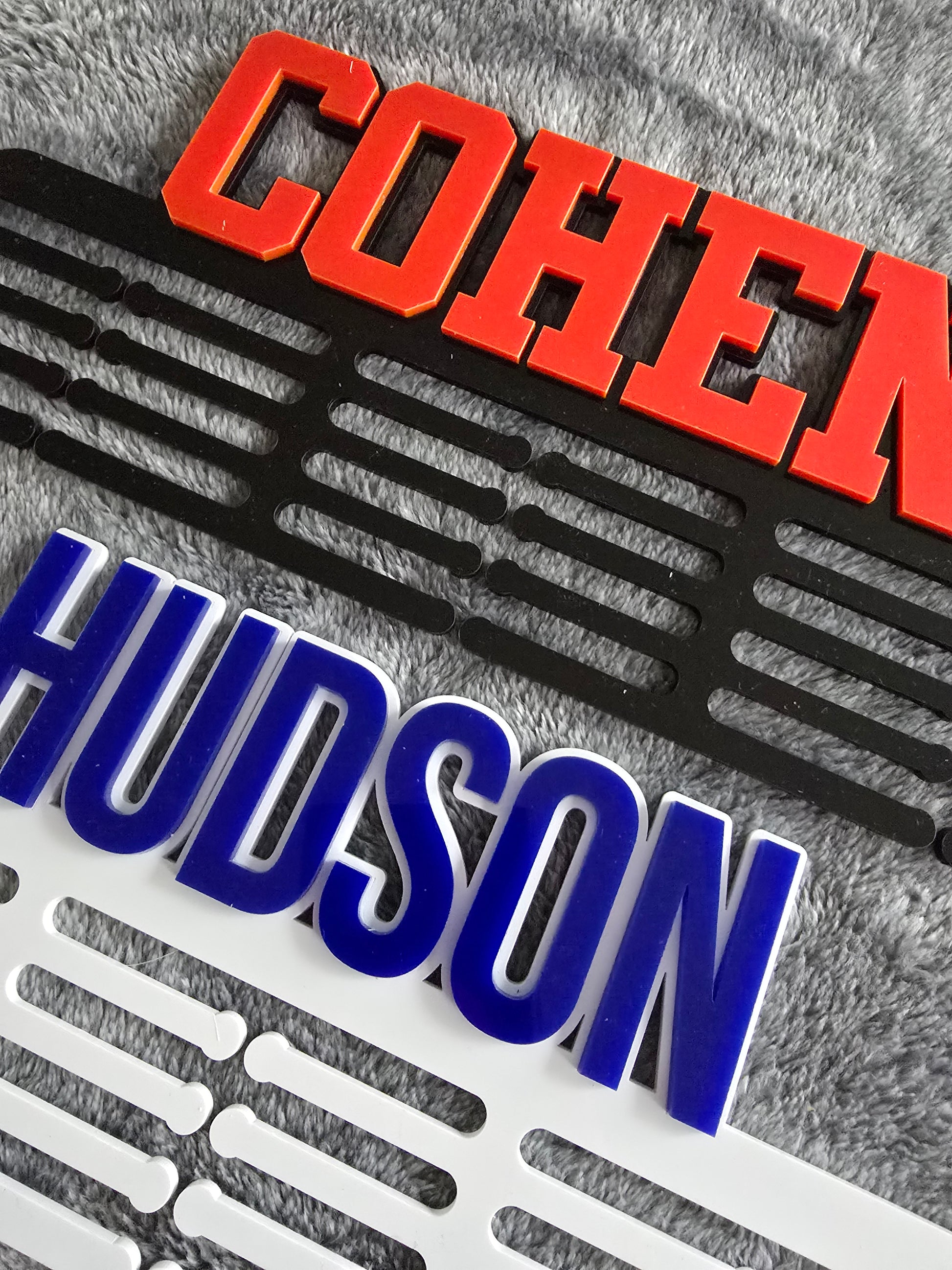 Celebrate achievements in style with this bold and personalized medal hanger! Crafted from durable materials, this wall-mounted display features a custom name in striking colours in various fonts inclusing varsity-style lettering, standing out against a sleek black, white or clear frosted base. With multiple slots for hanging medals, it's perfect for showcasing accomplishments in running, sports, martial arts, and more.