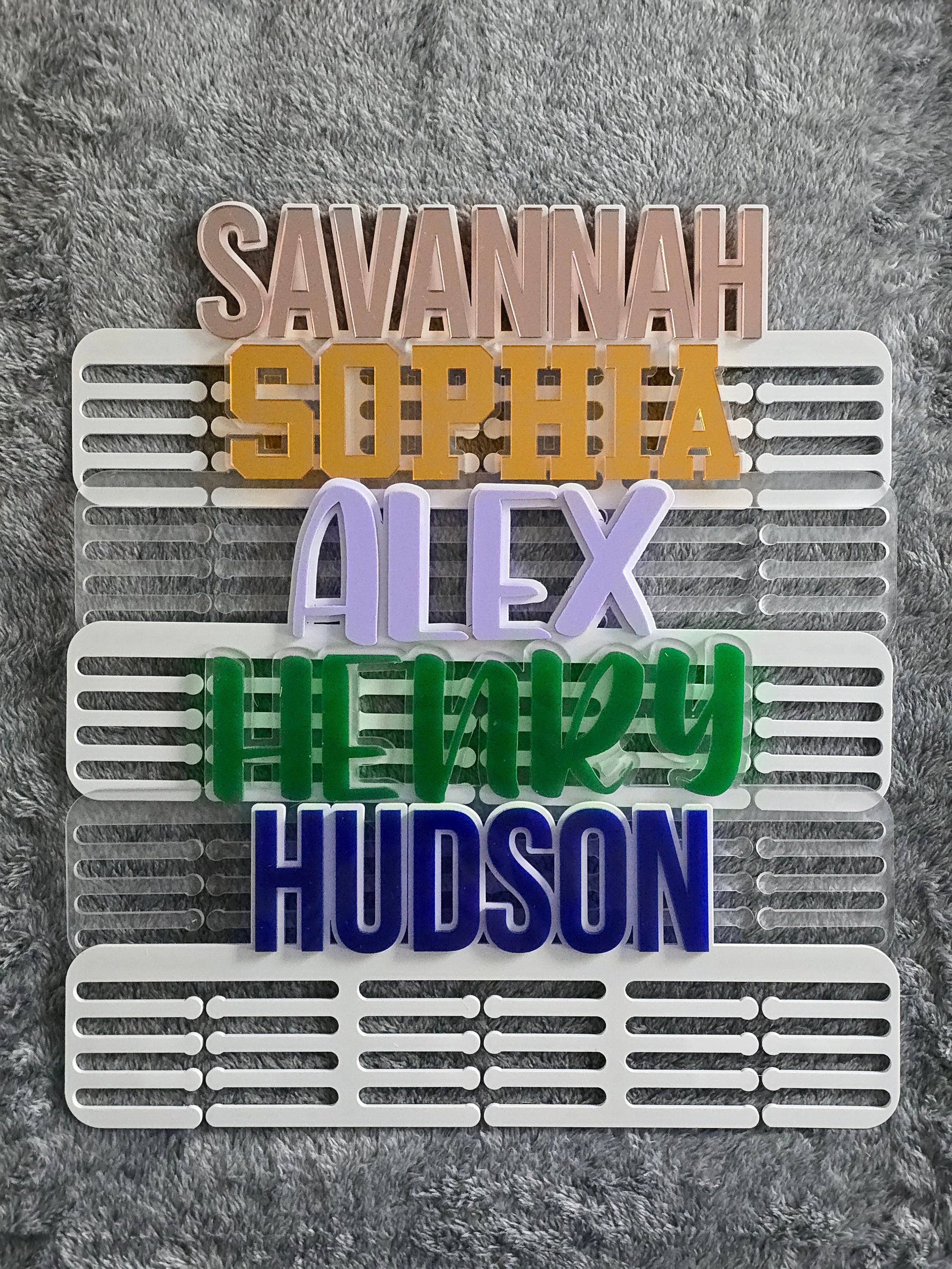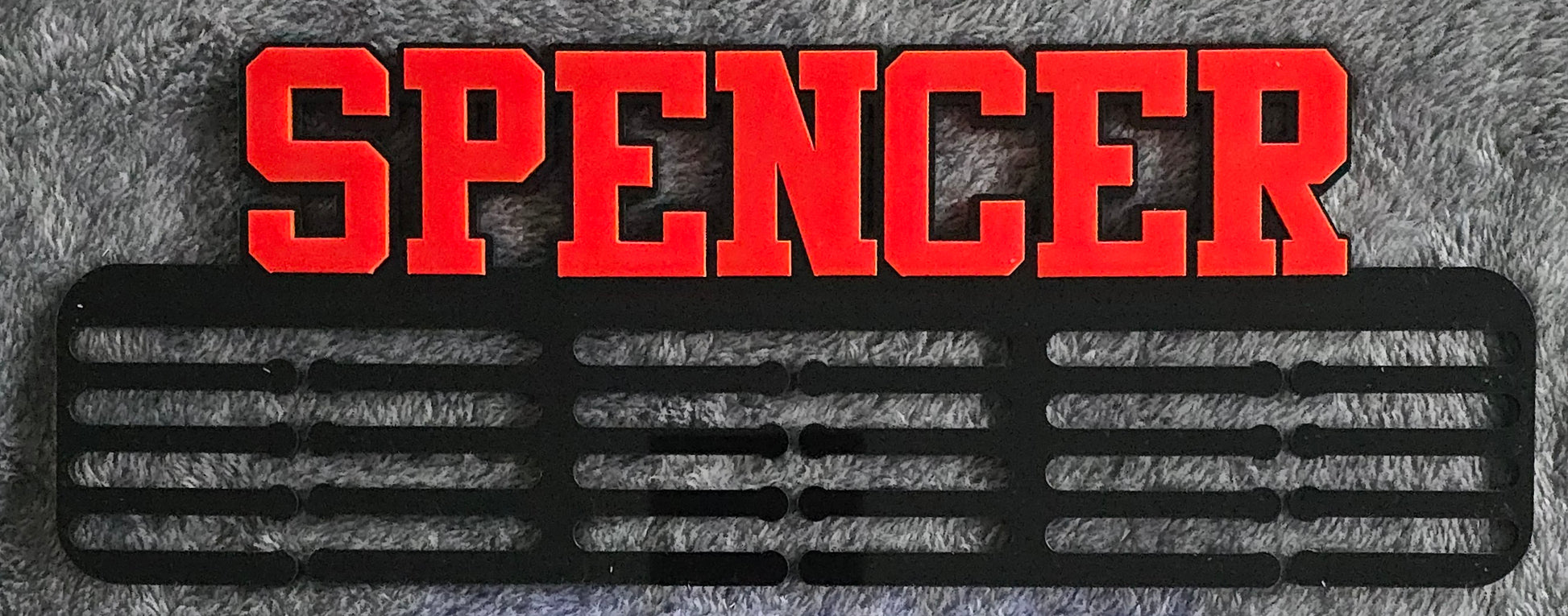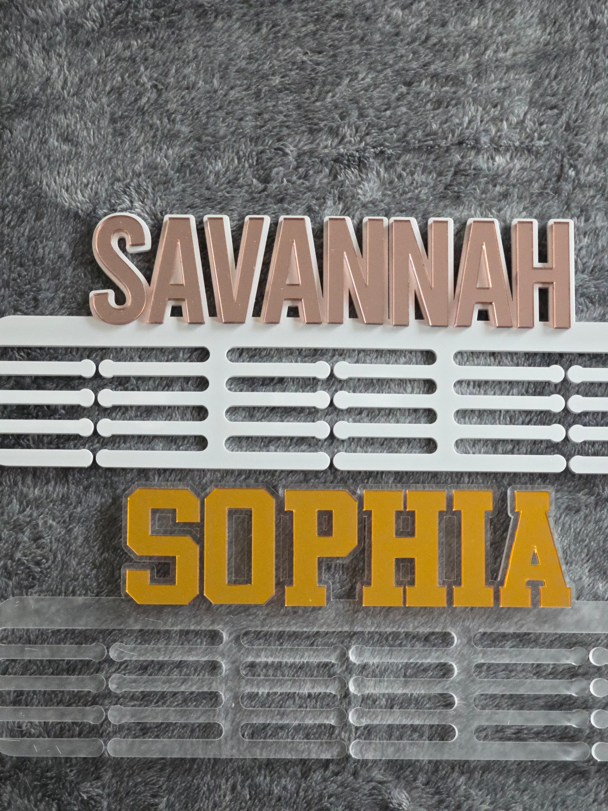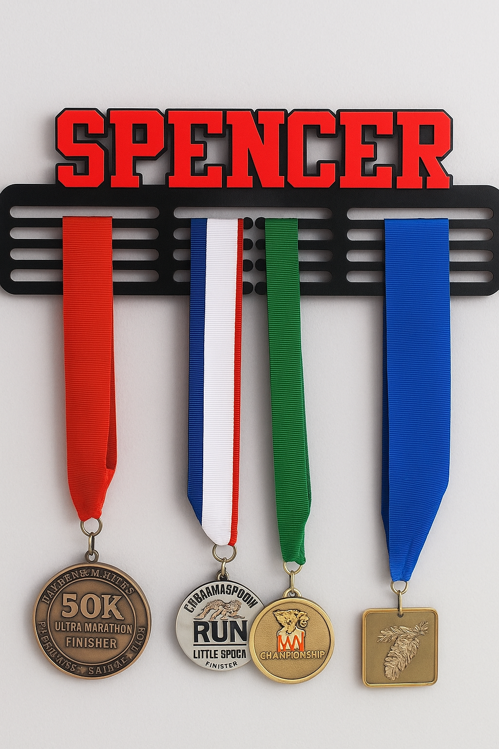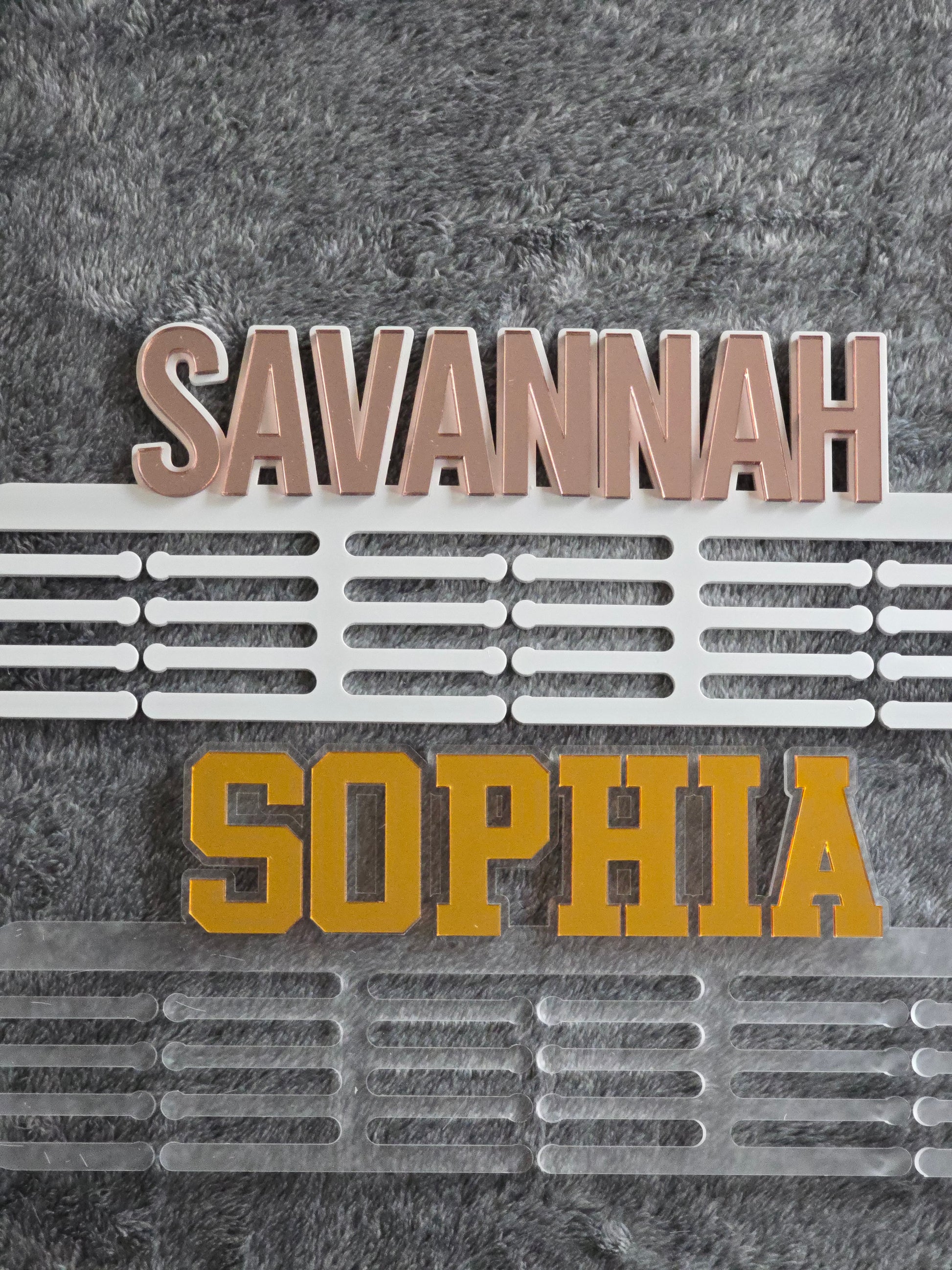 Celebrate achievements in style with this bold and personalized medal hanger! Crafted from durable materials, this wall-mounted display features a custom name in striking colours in various fonts inclusing varsity-style lettering, standing out against a sleek black, white or clear frosted base. With multiple slots for hanging medals, it's perfect for showcasing accomplishments in running, sports, martial arts, and more.
